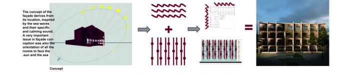 Koncepti i fasadës rrjedh nga vendndodhja e saj, frymëzuar nga valët e detit dhe tingulli i tyre i qartë dhe qetësues. Një çështje shumë e rëndësishme në konceptimin e fasadave ishte dhe orientimi i dhomave përballë me diellin dhe detin.