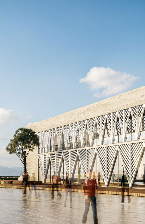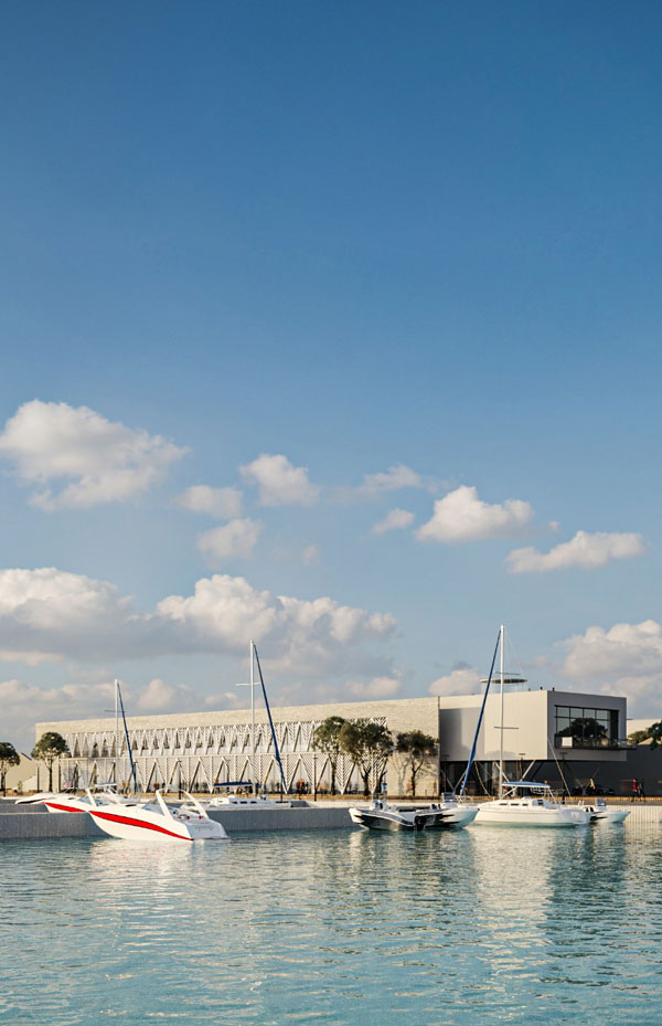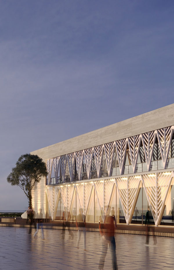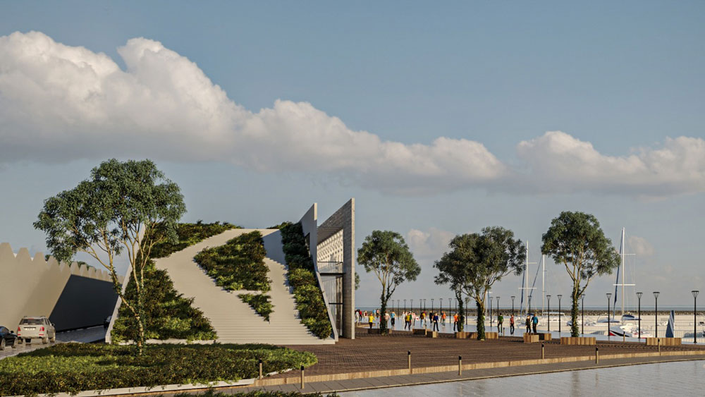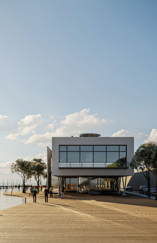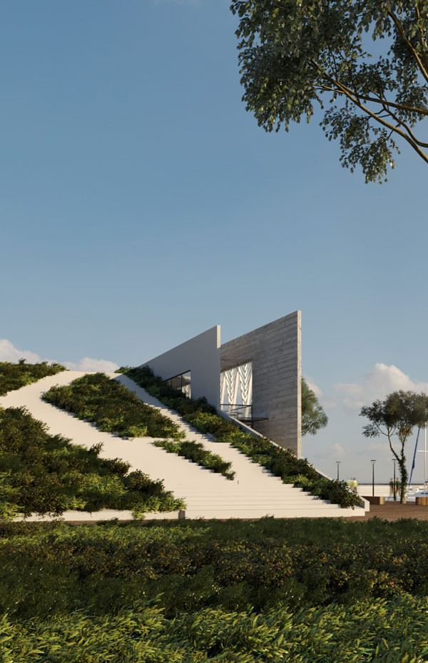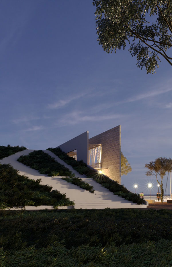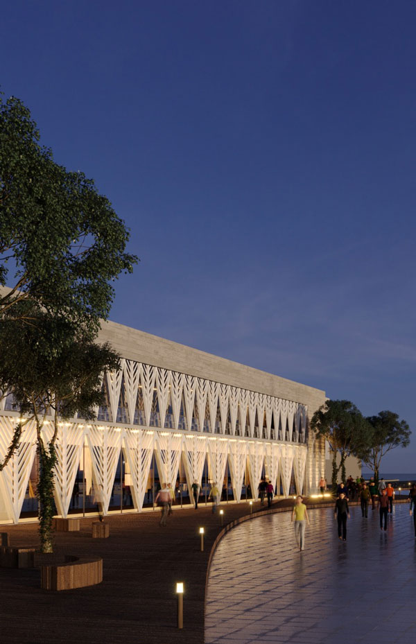 The proposed building is conceived as a continuation of the promenade, not impeding both movement and viewing along the walk on it. The sea-facing façade is a large shading window designed to cast shadows as well as give the building a unique character. This facility is situated at an important point between the promenade and the industrial port. It offers various entertainment and recreational facilities, which aim to enliven the city’s life.